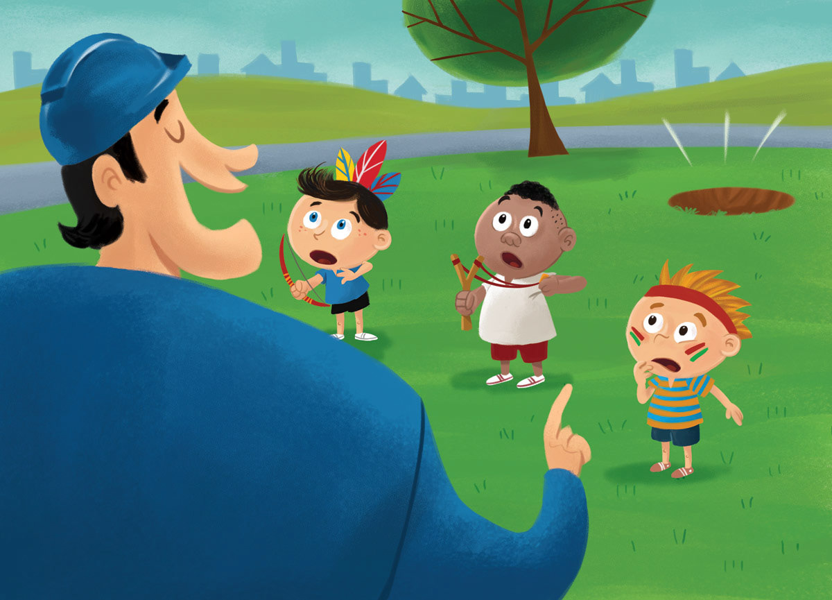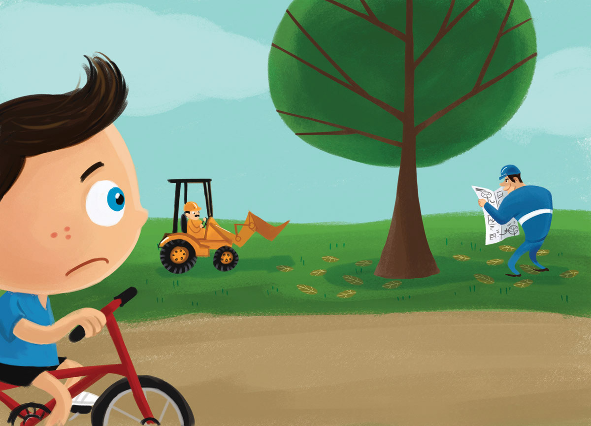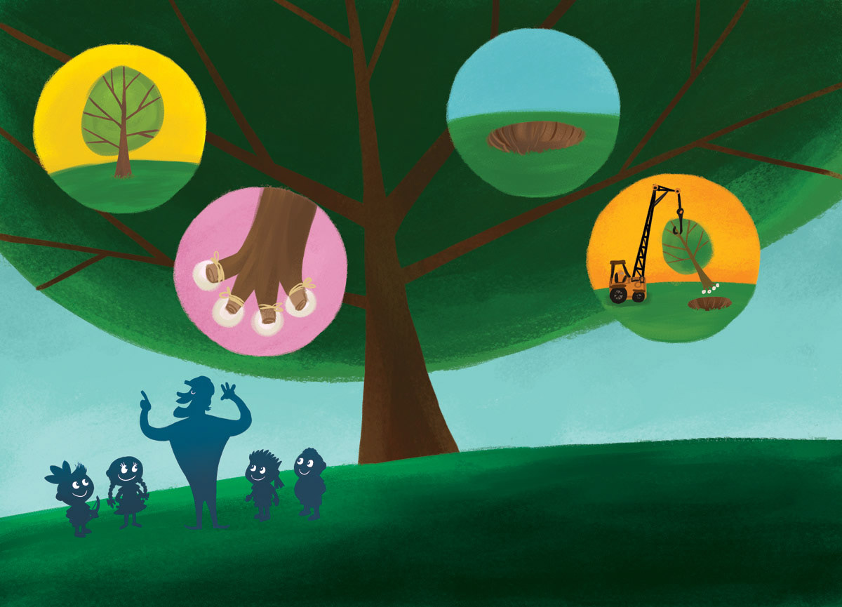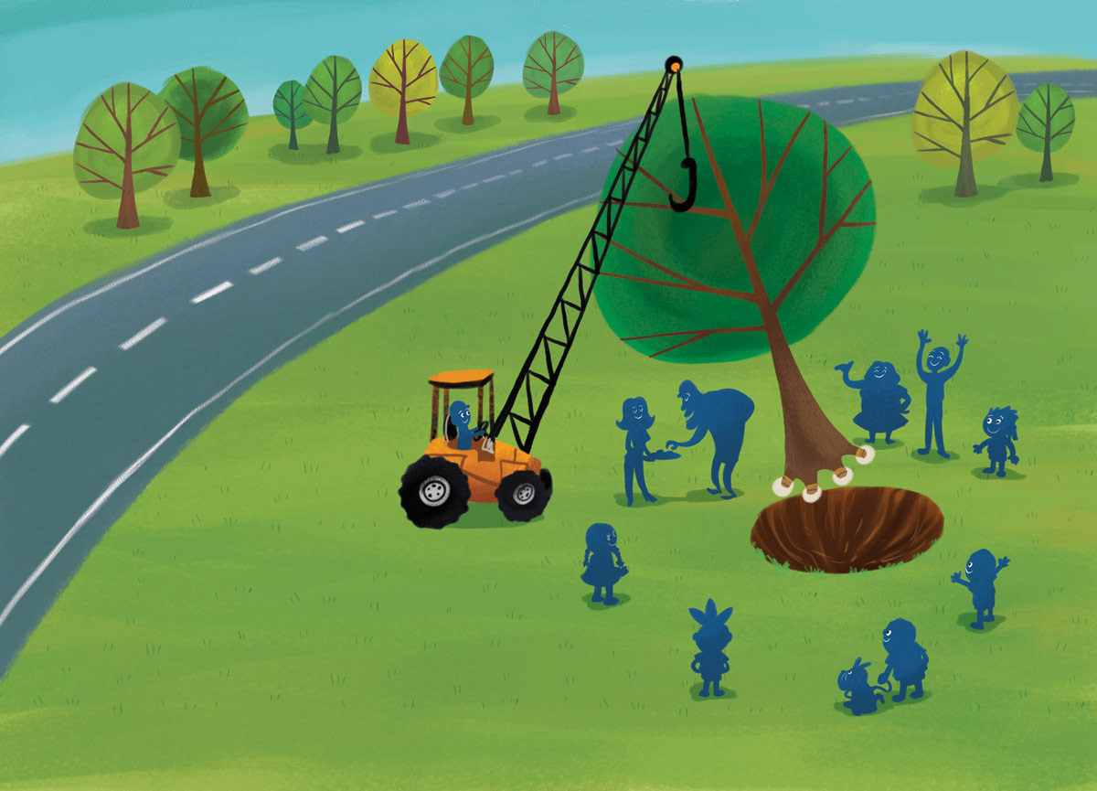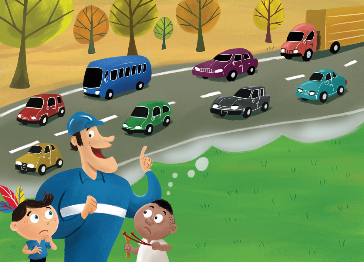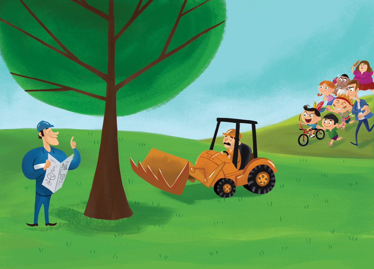 Illustrations for a children’s book distributed in schools across São Paulo, Brazil. The story follows Pedro, a boy who sets out to save a giant tree he believes will be destroyed to make way for a new road. In the end, he learns that the tree is not being harmed but carefully relocated, highlighting the importance of caring for nature while balancing urban development. Through expressive and colorful artwork, the book inspires children to value trees as essential allies for a healthier, more sustainable city.